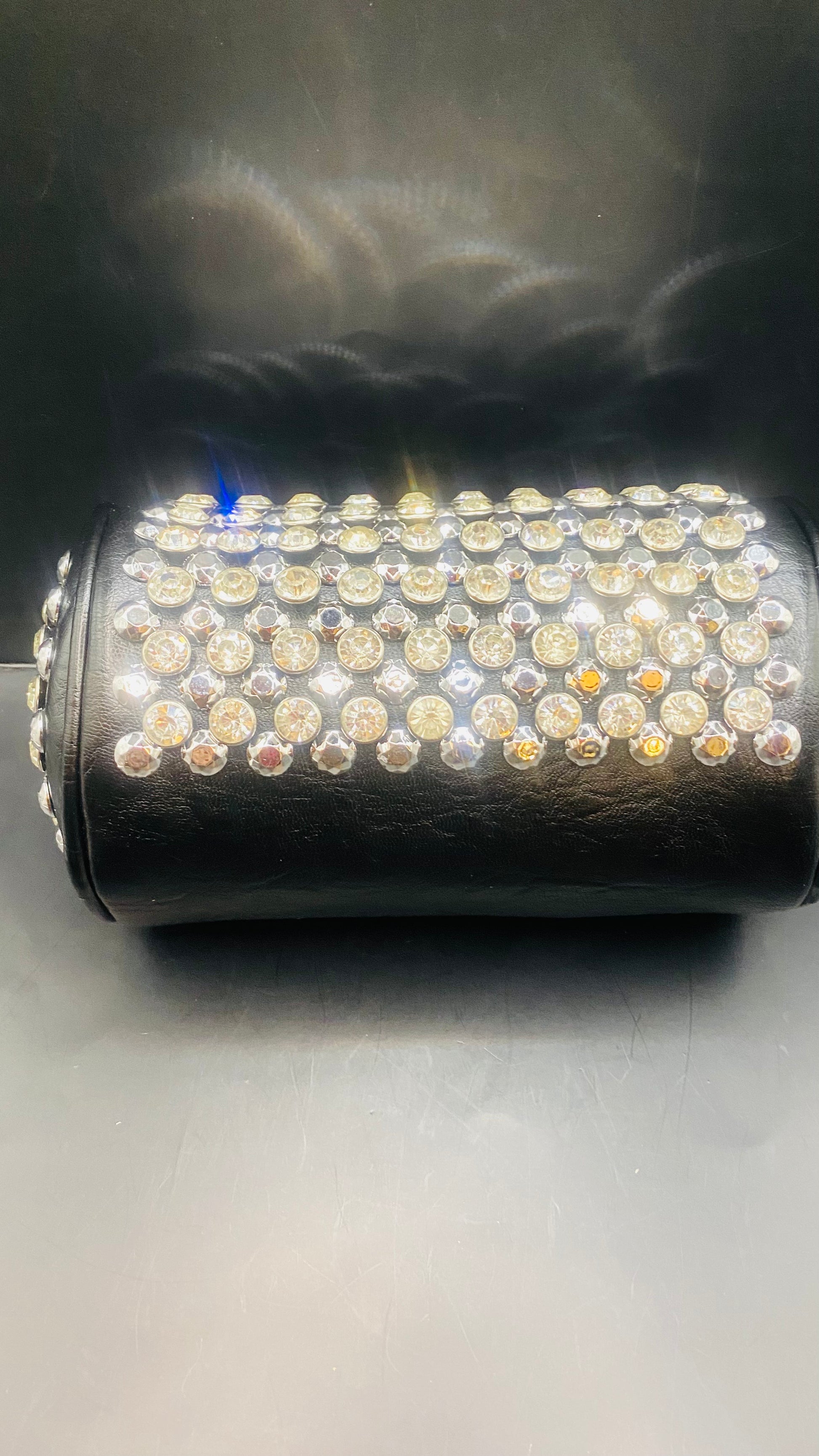 Black Rhinestone hand bag with a strap.
